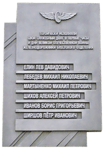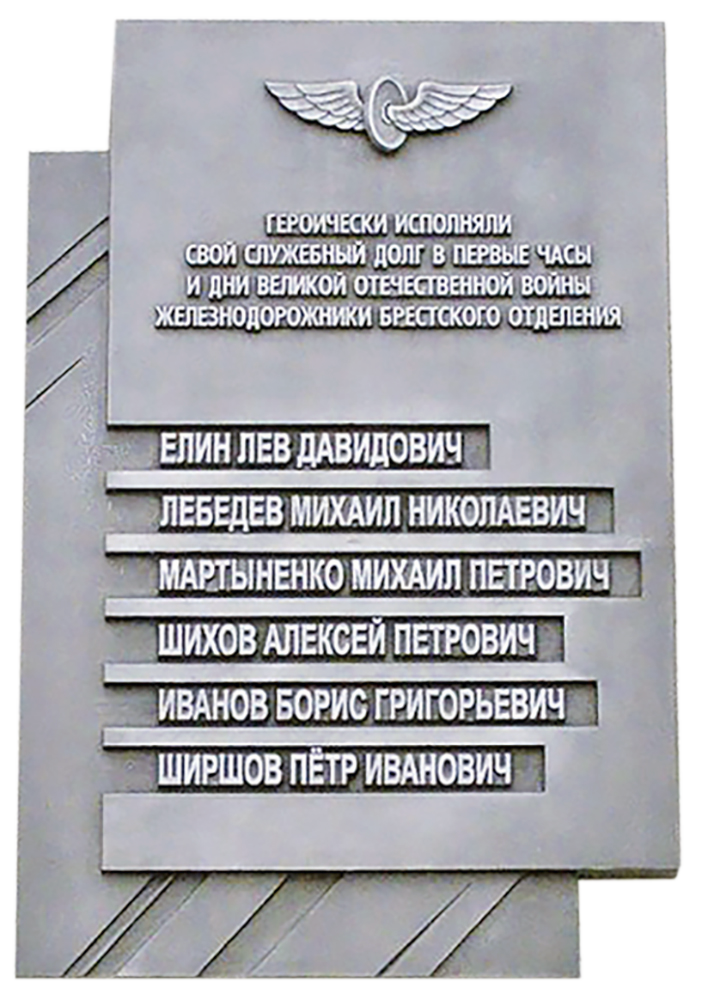 На здании железнодорожного вокзала в Бресте размещена мемориальная доска со следующей надписью: «Героически исполняли свой служебный долг в первые часы и дни Великой Отечественной войны железнодорожники Брестского отделения Елин Лев Давидович, Лебедев Михаил Николаевич, Мартыненко Михаил Петрович, Шихов Алексей Петрович, Иванов Борис Григорьевич, Ширшов Петр Иванович». Это имена подлинных героев, в числе первых вставших на пути коричневой чумы.
