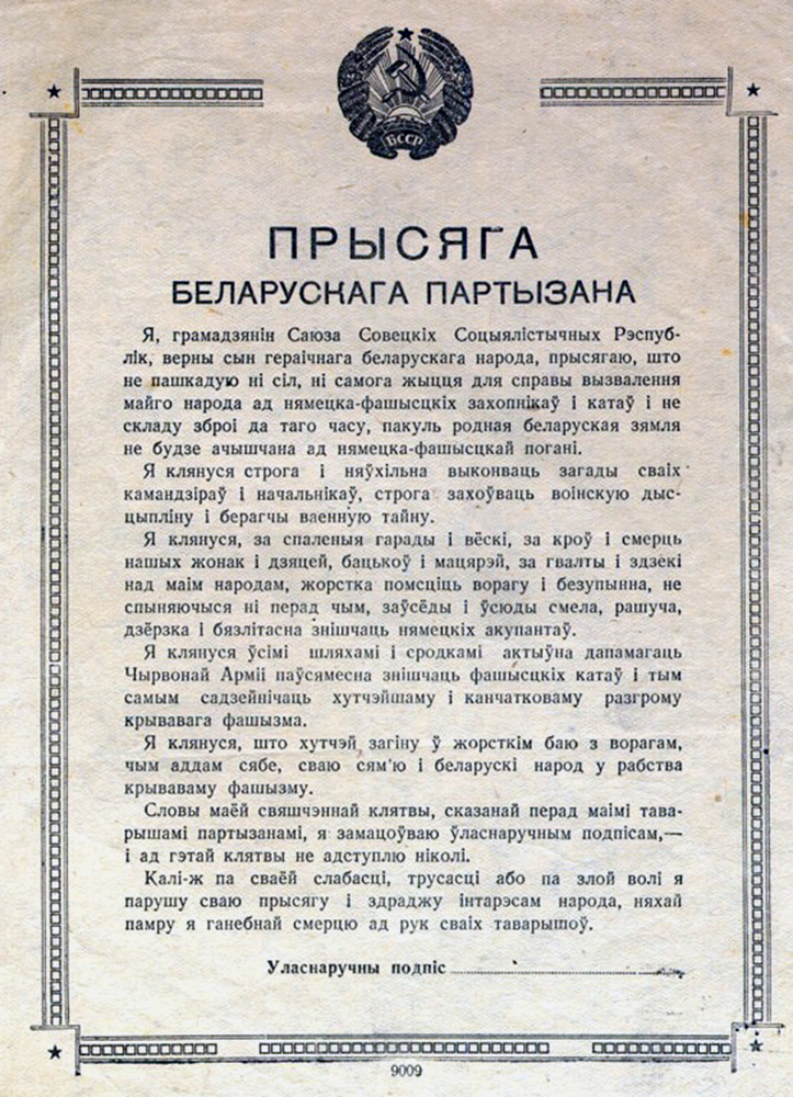 «Я, гражданин Союза Советских Социалистических Республик, верный сын героического белорусского народа, присягаю и не пожалею ни сил, ни самой жизни для дела освобождения моего народа от немецко-фашистских захватчиков и палачей и не сложу оружия до тех пор, пока родная белорусская земля не будет очищена от немецко-фашистской нечисти…». Первыми поставили свои подписи под текстом присяги командир отряда Виктор Панченков и комиссар Иосиф Волков, затем – все остальные бойцы. Вскоре на верность Отечеству присягнули все белорусские партизаны. Эта клятва еще больше сплачивала людей, повышала чувство долга и ответственности.