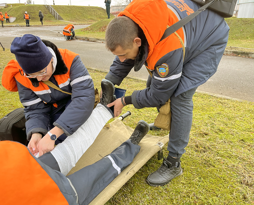 Санитарное звено работало слаженно, используя специальные сумки с медикаментами и носилки. «Пострадавшему» сразу оказали помощь. После всех необходимых мероприятий его передали бригаде скорой медицинской помощи для дальнейшей транспортировки в учреждение здравоохранения.