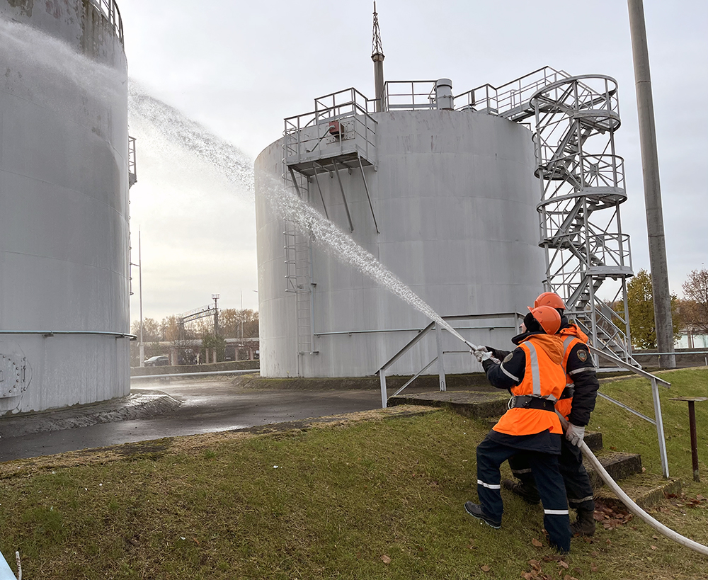 Кульминационной стала следующая часть учений: по легенде, из-за попадания дрона вспыхнул топливный склад.